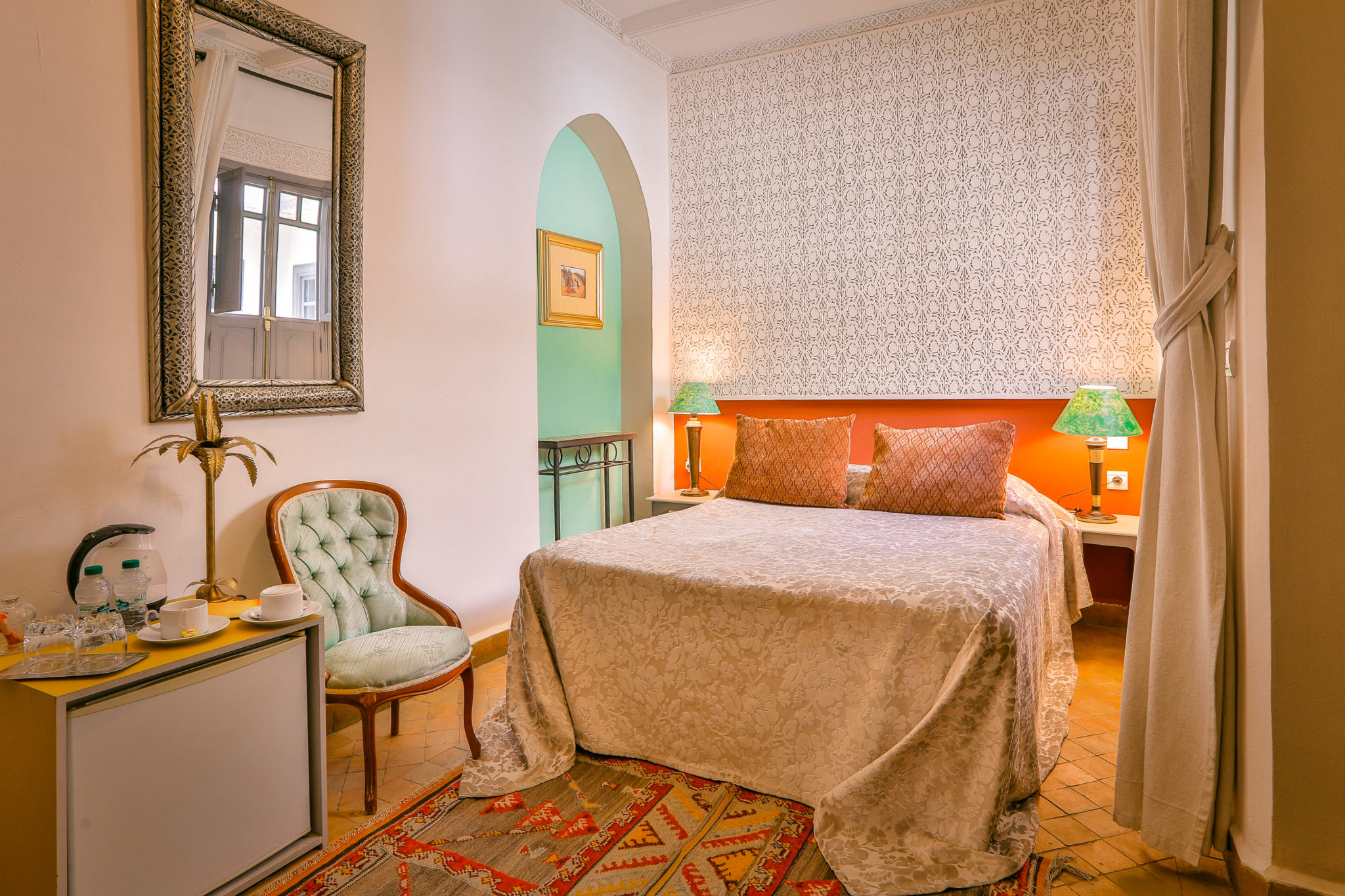 The Kharkhidi Double Room is located in the first courtyard of the Riad, on the ground floor. It has the option of a double bed or two separate single beds. It features a seating area with a sofa, minibar, air conditioning, and heating, an outdoor area, a shower, and a bathtub.